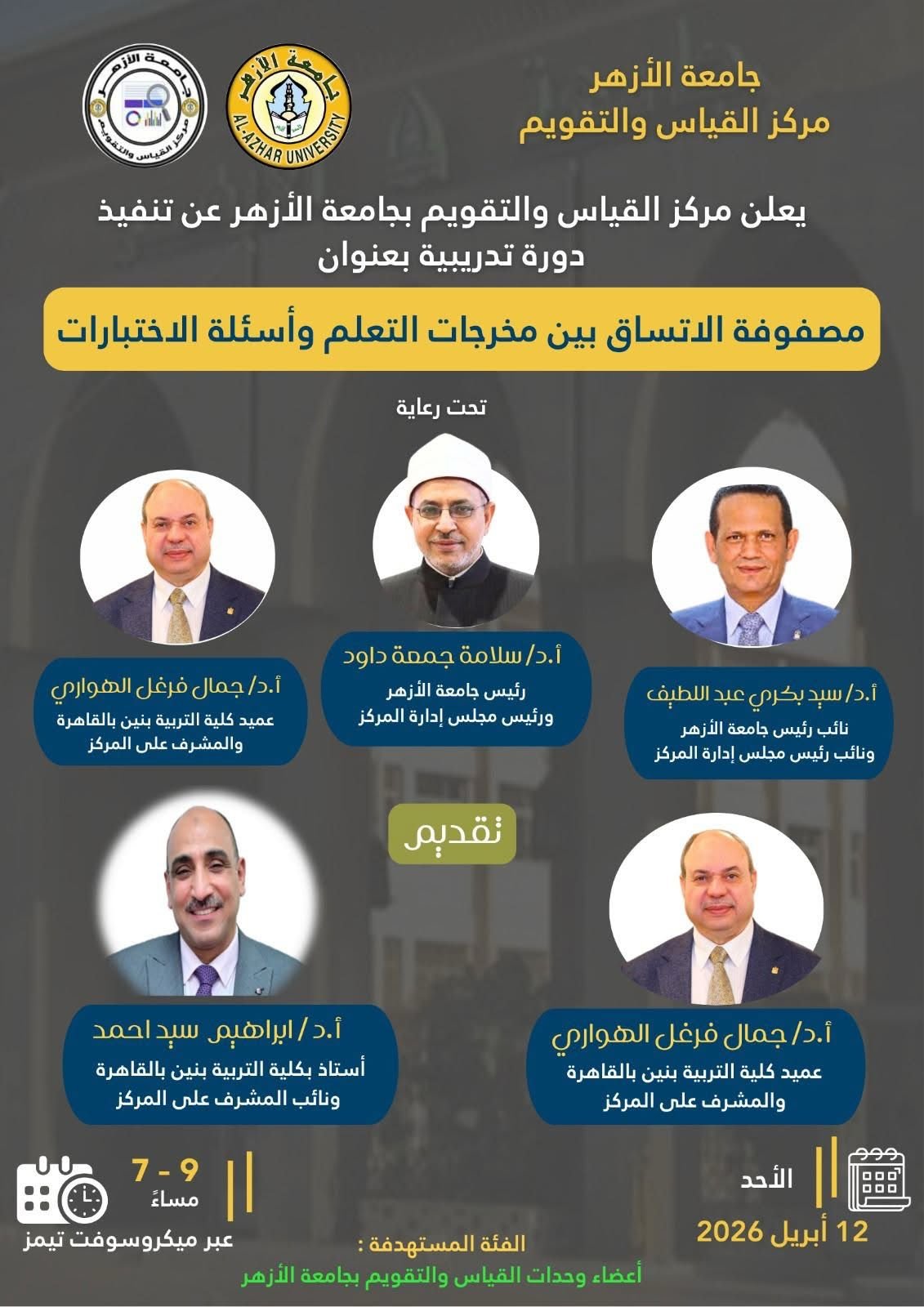 يُعلن مركز القياس والتقويم بجامعة الأزهر عن انعقاد دورة تدريبية بعنوان «مصفوفة الاتساق بين مخرجات التعلم وأسئلة الاختبارات» يوم الأحد المقبل الموافق 12 إبريل 2026م من الساعة 7 إلى 9 مساء.