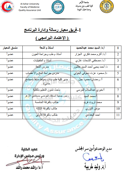 رسالة البرنامج: تلتزم كلية الطب بنين دمياط – جامعة الأزهر بتطبيق برنامج تعليمي طبي تكاملي يهدف لتخريج أطباء قادرين علي التعلم الذاتي والمهني المستمر وإجراء أبحاث علمية تطبيقية والإسهام الفعال في خدمة المجتمع مع زيادة القدرة التنافسية علي المستوي المحلي والإقليمي والدولي في إطار القيم الإسلامية بما يحقق التحسين والتطوير المستمر