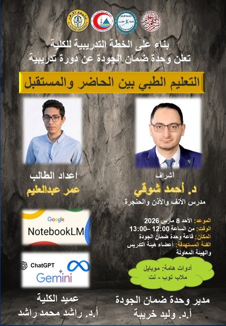 بناءا على الخطة التدريبية للكلية تعلن وحدة ضمان الجودة عن دورة تدريبية بعنوان: التعليم الطبي بين الحاضر والمستقبل