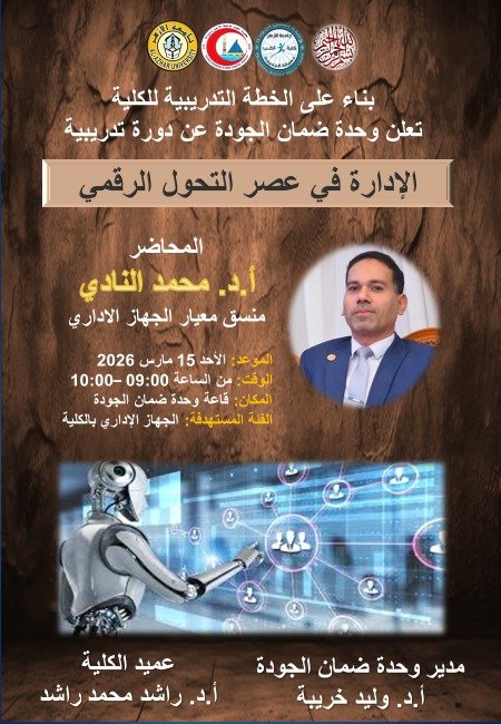 بناءا على الخطة التدريبية للكلية تعلن وحدة ضمان الجودة عن دورة تدريبية بعنوان: الإدارة في عصر التحول الرقمي