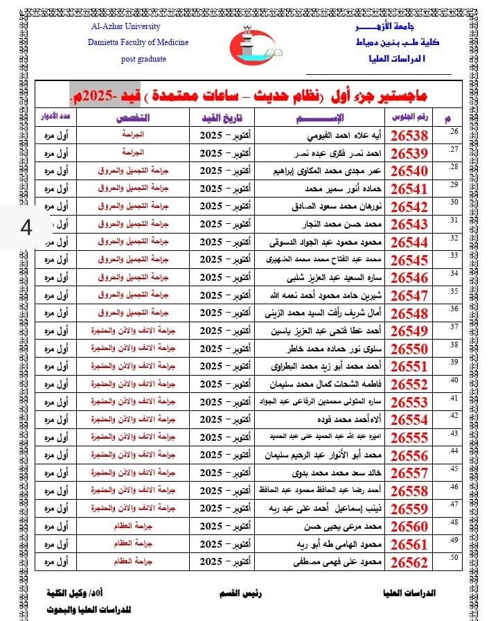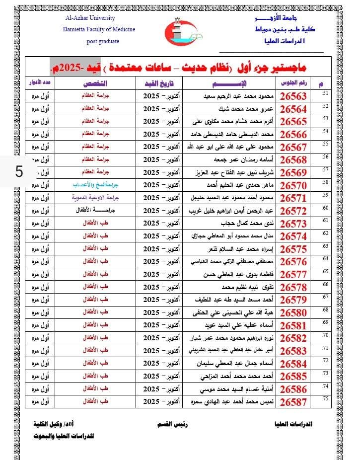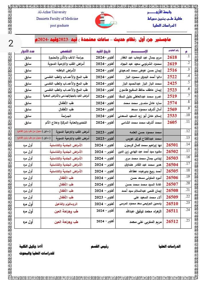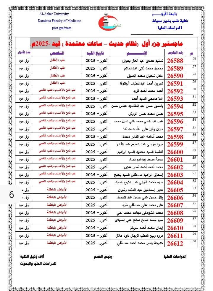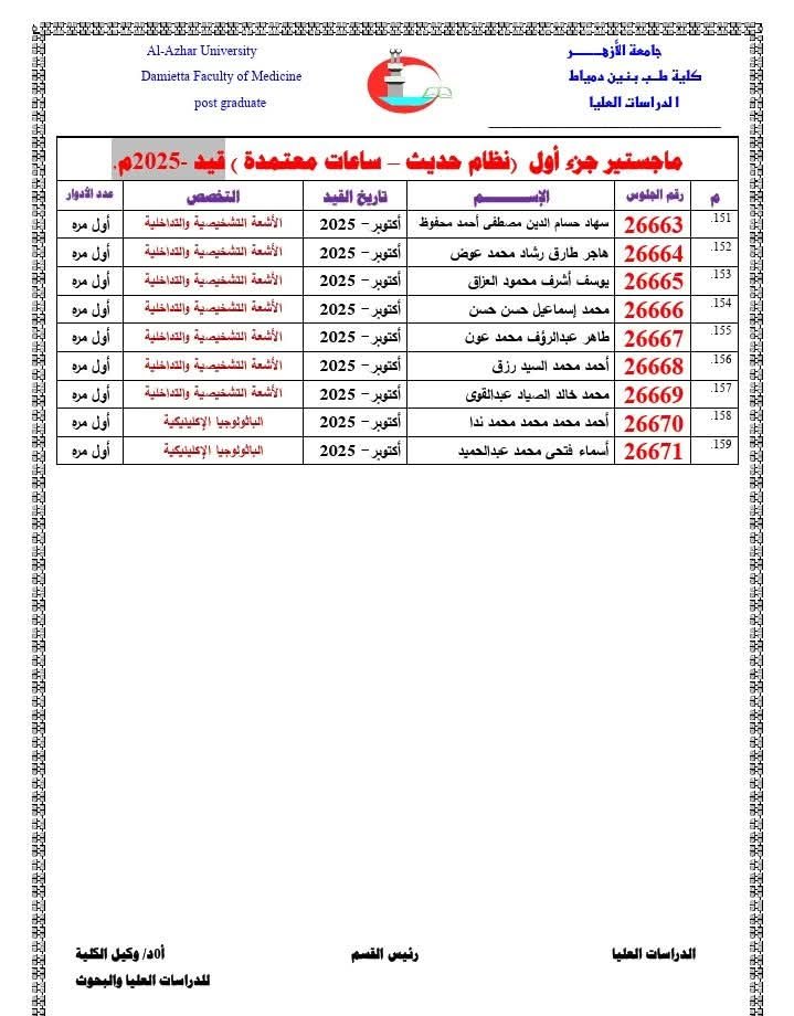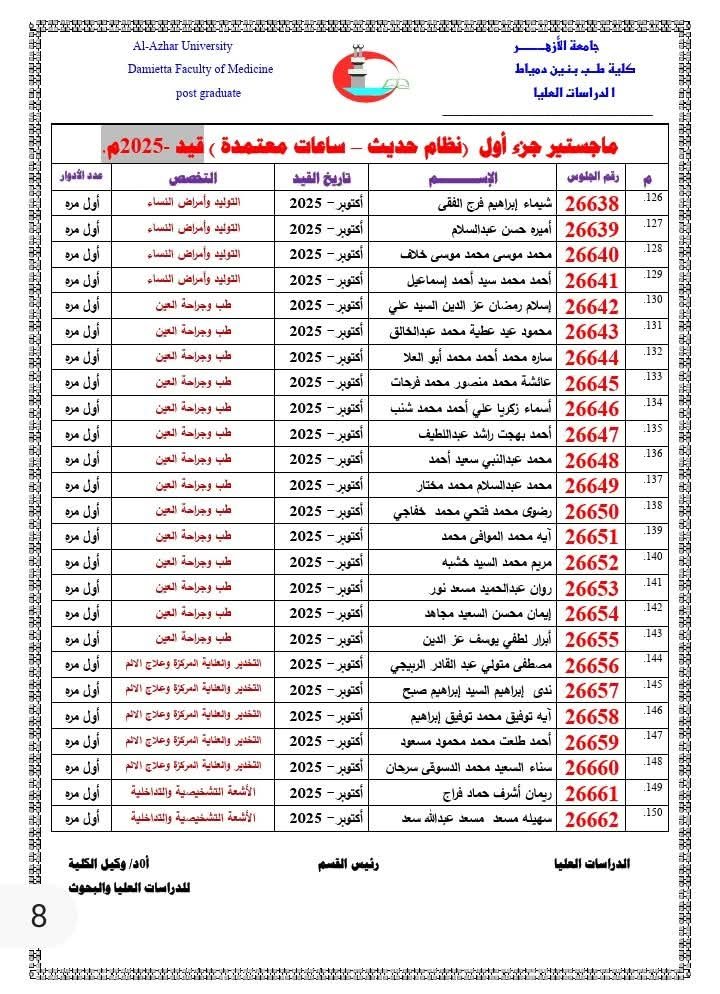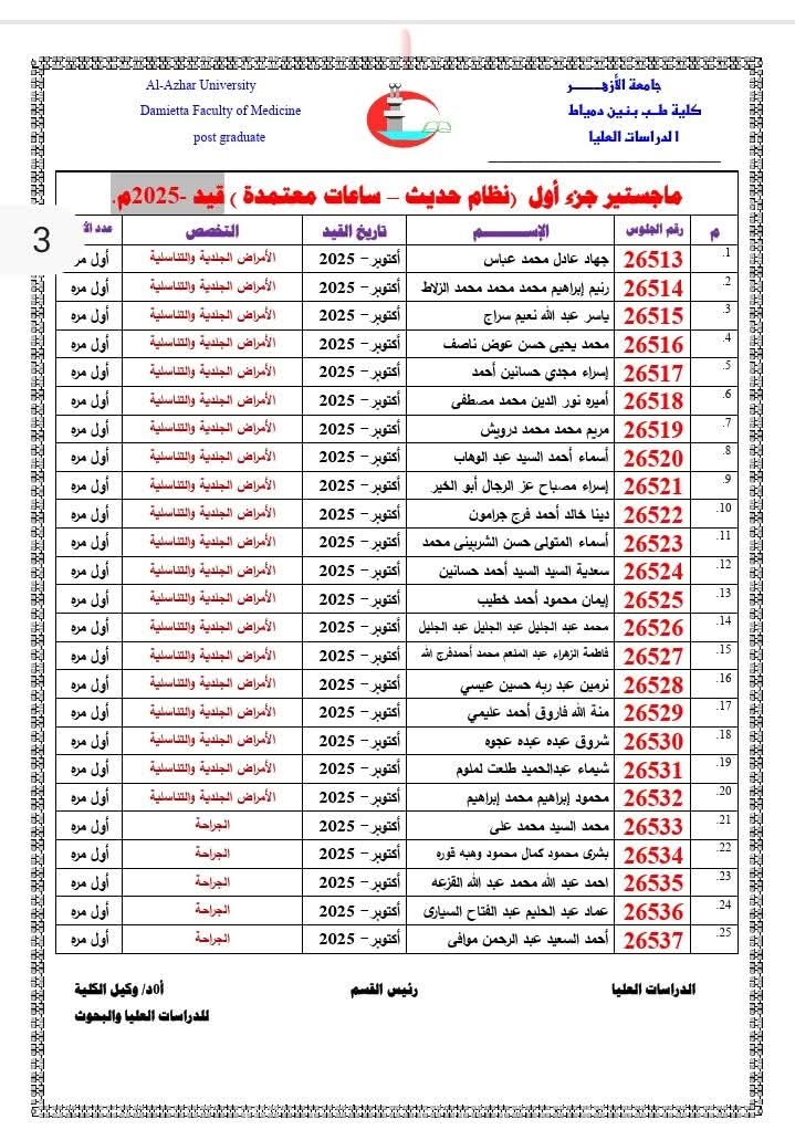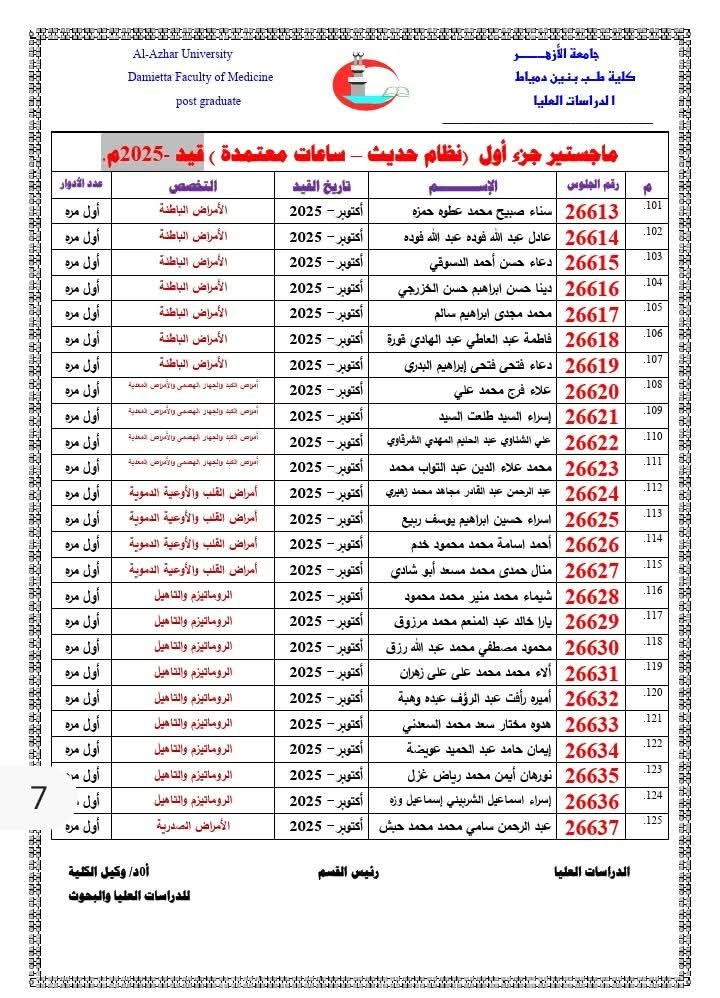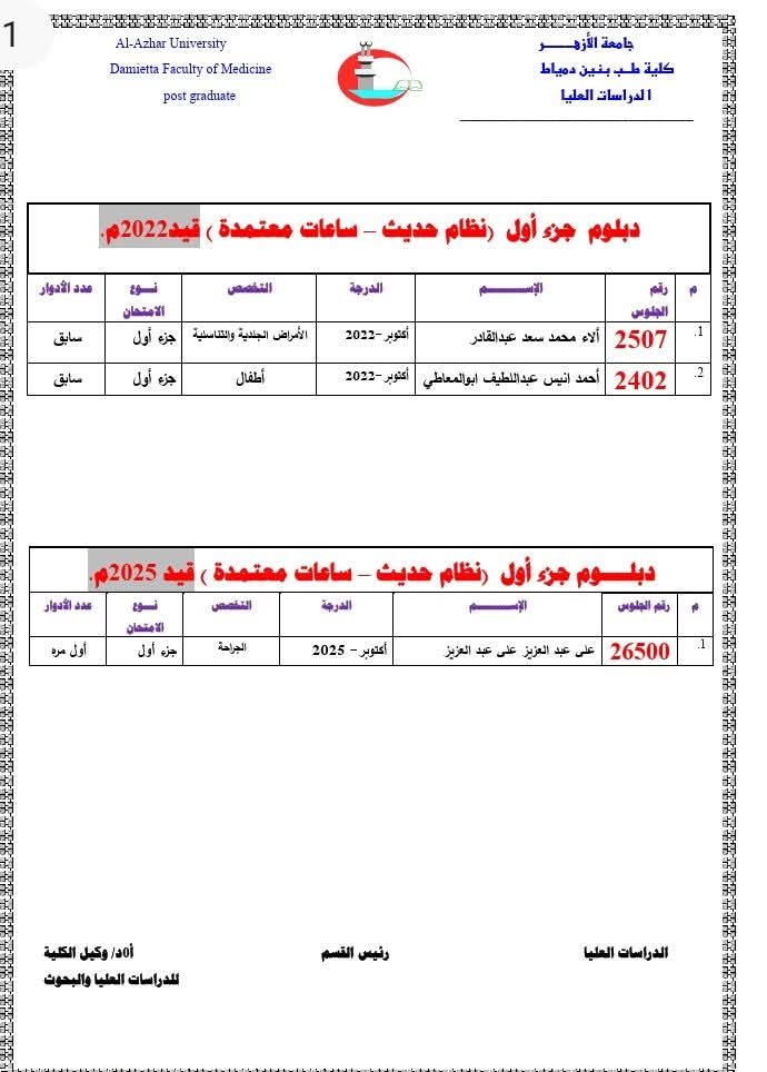 تُعلِن إدارةُ الدِّراسات العُليا بالكلية عن إتاحة أرقام الجلوس للأطباء والطبيبات المقرَّر دخولهم امتحانات: