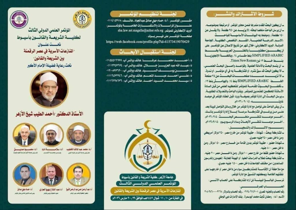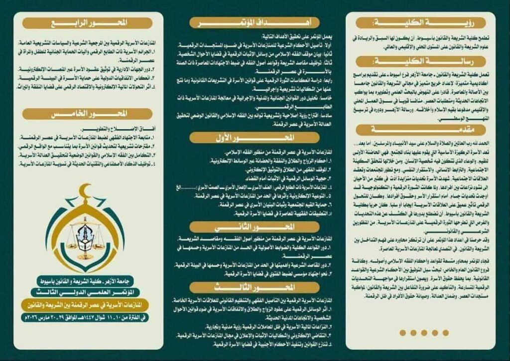 فاهتمامًا بتماسك الأسرة المصرية في ظل المستجدات الرقمية تعقد كلية الشريعة والقانون بأسيوط مؤتمرها الدولي في الفترة من 29 إلى 30 مارس 2026م لمناقشة المنازعات الأسرية في عصر الرقمنة بين الشريعة والقانون؛ بهدف تأصيل الأحكام الشرعية للمنازعات الأسرية في ظل المستجدات الرقمية، وتوضيح موقف الفقه الإسلامي من وسائل الإثبات الرقمية، وضبط الاجتهادات المعاصرة، ودراسة تأثير الثورة الرقمية على قوانين الأسرة، وتحليل دور القوانين المدنية والجنائية، واقتراح رؤية تشريعية متوازنة بين الفقه الإسلامي والقانون الوضعي.