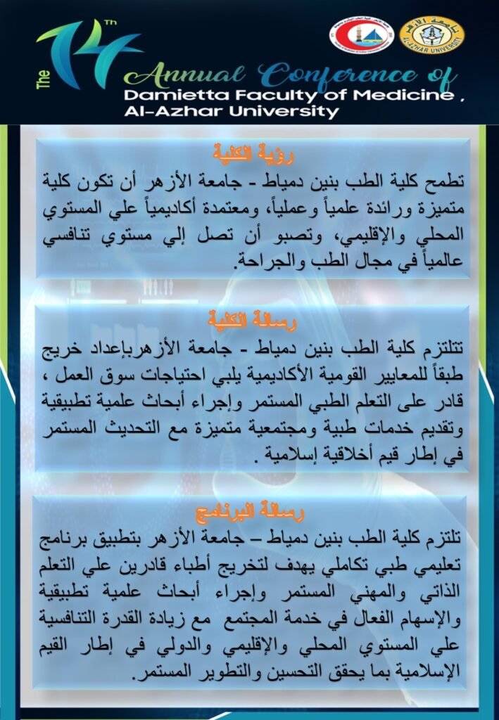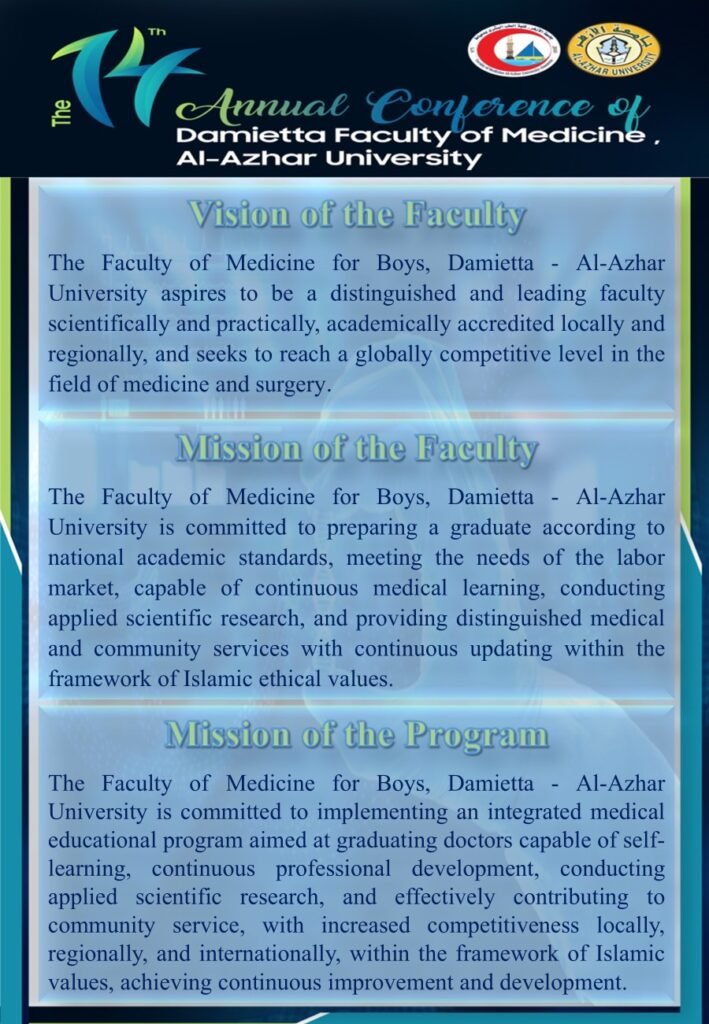 تطمح كلية الطب بنين دمياط ـ جامعة الازهر أن تكون كلية متميزة ورائدة علمياً وعملياً ومعتمدة أكاديمياً على المستوى المحلي والإقليمي وتصبو أن تصل الي مستوي تنافسي عالميا في مجال الطب والجراحة.