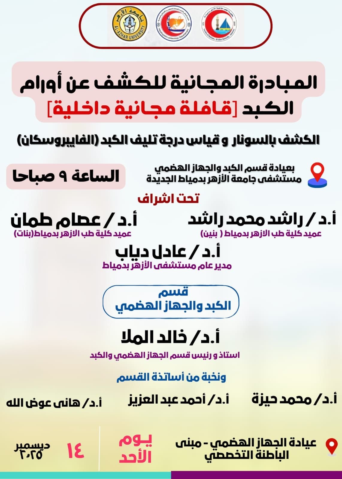 تأتي هذه المبادرة الحيوية تحت إشراف الدكتور راشد محمد راشد عميد كلية طب بنين والدكتور عصام طمان عميد كلية طب بنات وإشراف عام من الدكتور عادل دياب مدير عام مستشفى الأزهر بدمياط كما يقود الفريق الطبي المتخصص لفيف من كبار أساتذة الكبد والجهاز الهضمي وهم الدكتور خالد الملا استاذ ورئيس قسم الجهاز الهضمي والكبد والدكتور محمد حيزة والأستاذ الدكتور أحمد عبد العزيز والأستاذ الدكتور هاني عوض الله وذلك من خلال عيادة الجهاز الهضمي الموجودة داخل مبنى الباطنة التخصصي بالمستشفى الجامعي