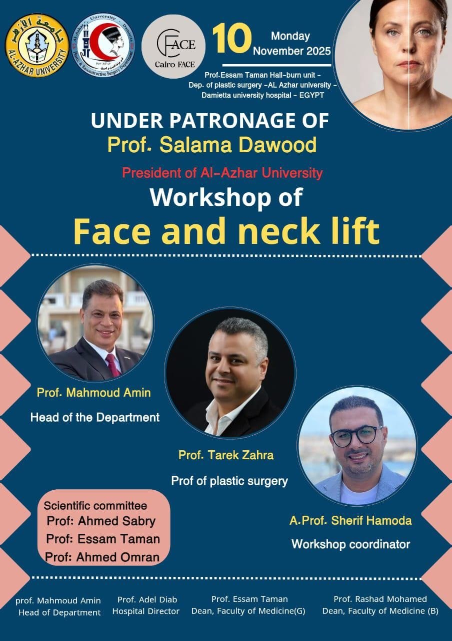 نُظِّمت يوم الاثنين العاشر من نوفمبر ورشة عمل لقسم جراحة التجميل بمستشفى الأزهر بدمياط الجديدة، عن جراحات شد الوجة والرقبه المتقدمه