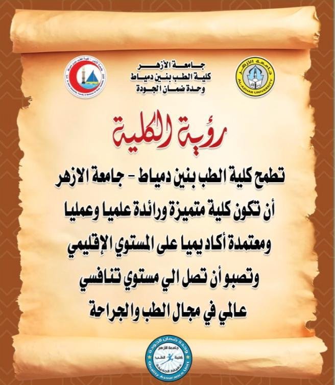 تطمح كلية الطب بنين دمياط ـ جامعة الازهر أن تكون كلية متميزة ورائدة علمياً وعملياً ومعتمدة أكاديمياً على المستوى الإقليمي وتصبو أن تصل الي مستوي تنافسي عالمي في مجال الطب والجراحة.